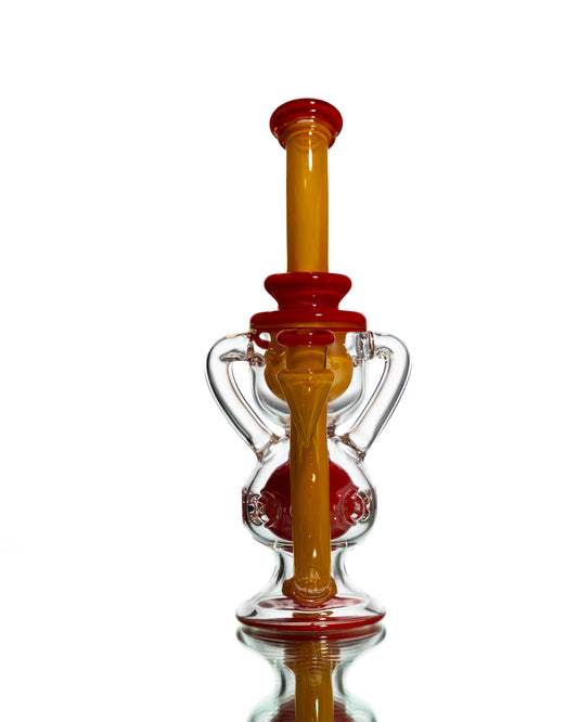 His Iconic pieces are easily recognizable based on the sharp cone shape below the joint. Tube Sock's signature design, "The Begg Beater" recycler, features dual uptakes and a torus-style drain. Crafted with meticulous precision, these piece's boasts eight flawlessly formed holes on its body. These strategically placed holes, contribute to an intensified level of percolation. This further enhances the already impressive functionality of the dual-chambered inner and outer recyclers. The combination of these features with the floating puck perc results in a remarkably smooth draw that delivers potent rips, all while creating a mesmerizing internal whirlpool effect. It's a true testament to the engineering marvel behind this piece!