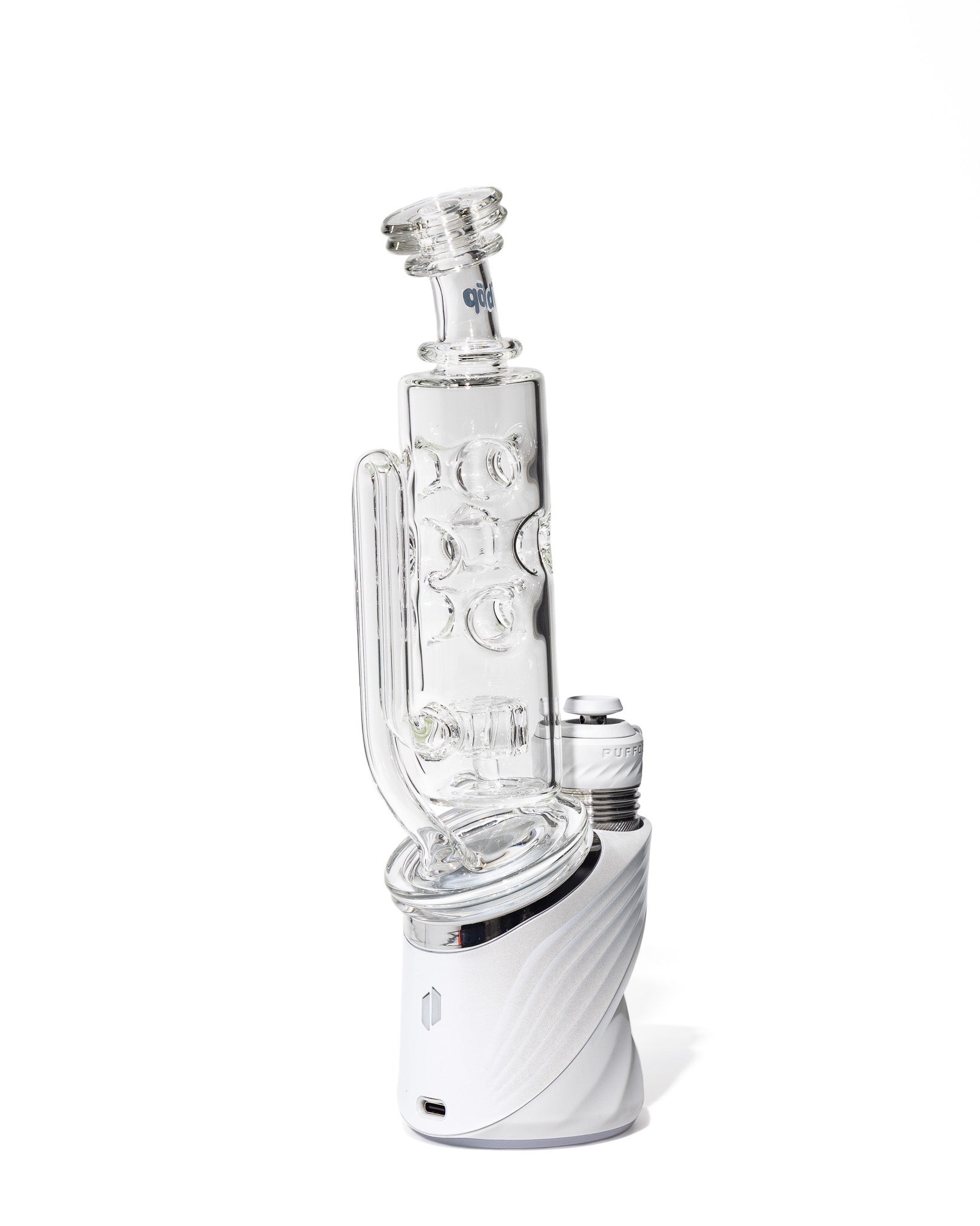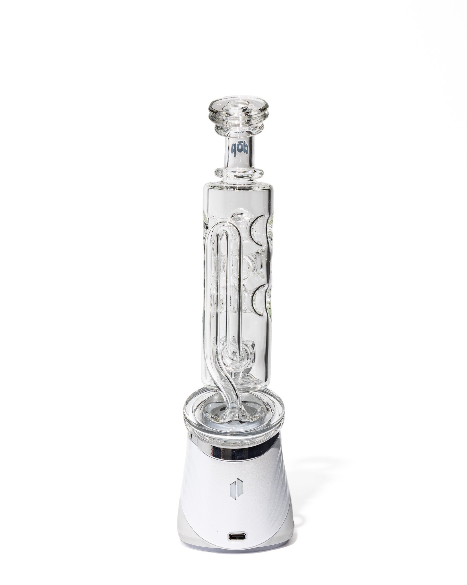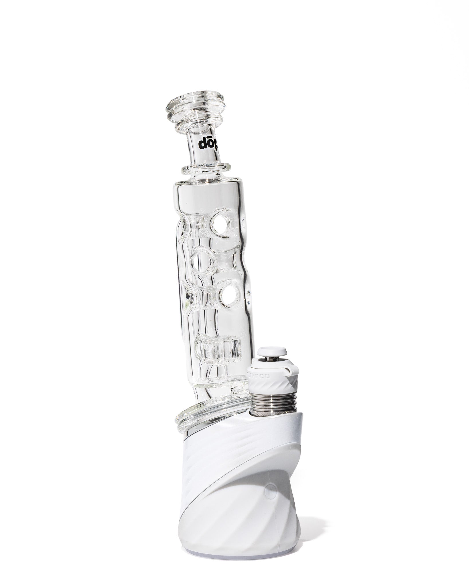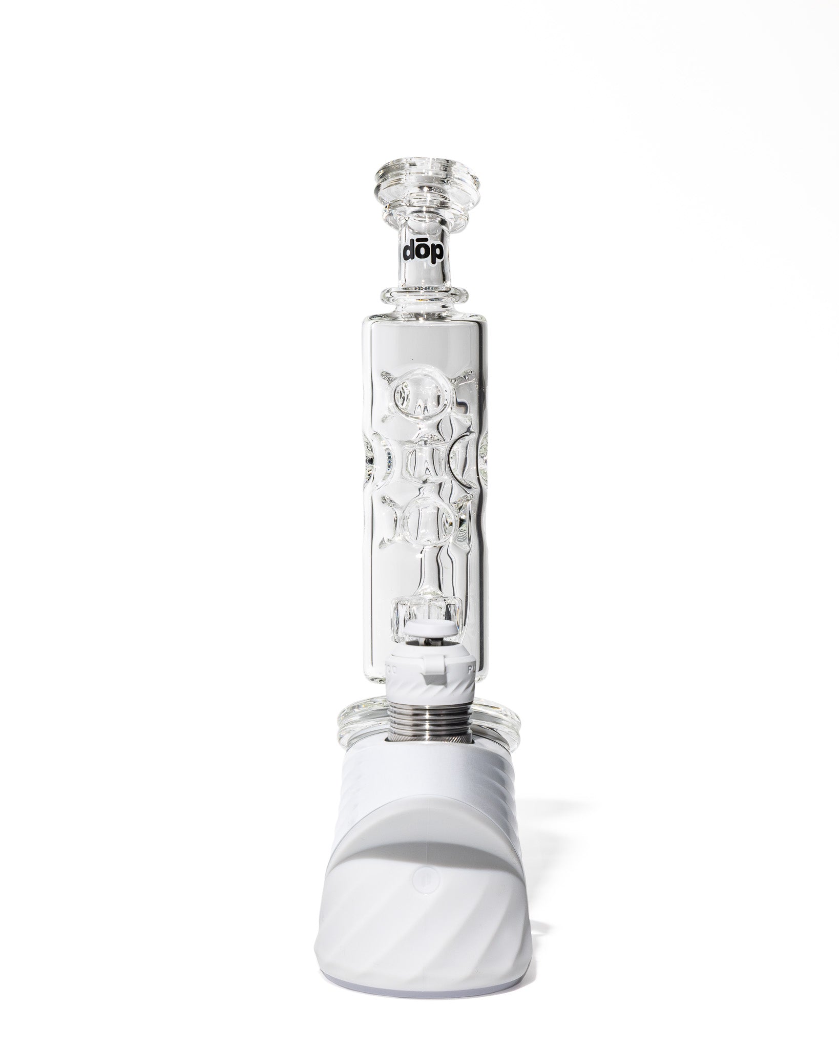 Design Details: This futuristic tower-style attachment boasts a sculpted straight tube body with embossed circular puck indents that double as grip points and visual accents. Crafted from ultra-clear borosilicate, the symmetrical form factor is clean, modern, and built with a stacked aesthetic that pops.