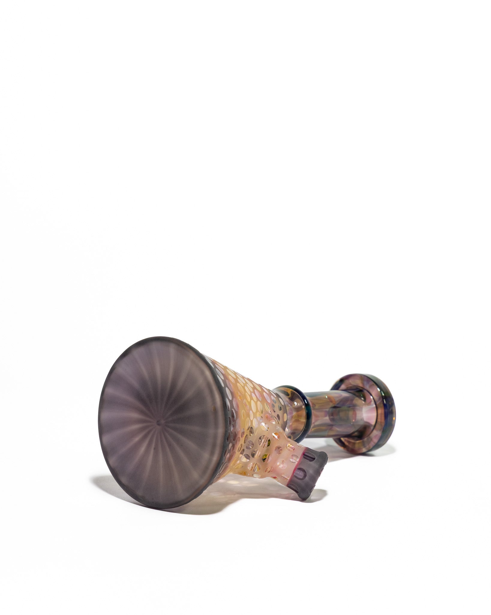 Design Details: This vibrant beaker by Gobs Glass features a fixed purple downstem paired with circular frosted accents, creating a soft, etched texture that adds dimension and grip. The contrasting purple and yellow tones bring a playful yet refined look to this compact design.